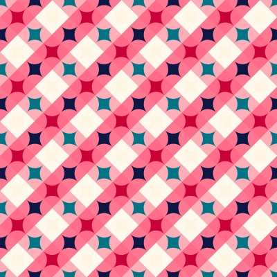 핑크, 레드, 네이비, 티얼 컬러의 원형과 사각형이 대각선으로 반복되는 모던 기하학 패턴