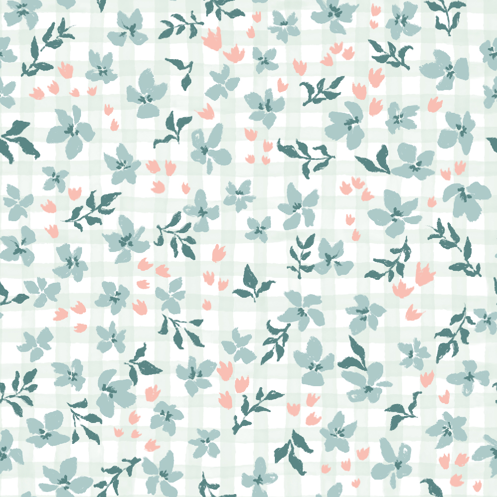 패턴설명 수채화 체크 백그라운드 위에 꽃이 아름답게 펼쳐진 플로럴 패턴입니다.